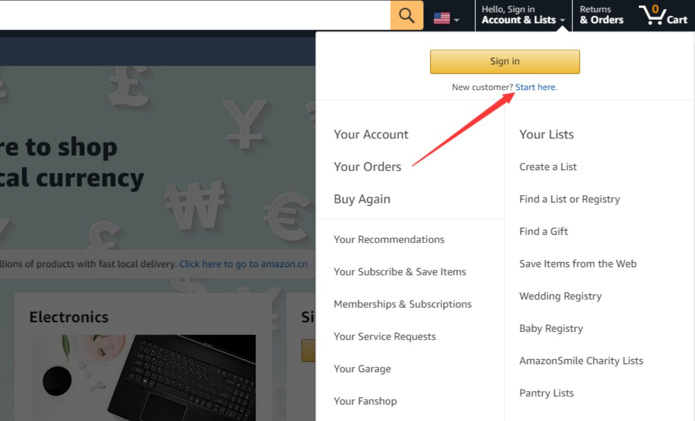 1.打开亚马逊国际站的官网 www.Amazon.com 鼠标放在右上角会显示账号菜单,点击start here进入注册界面