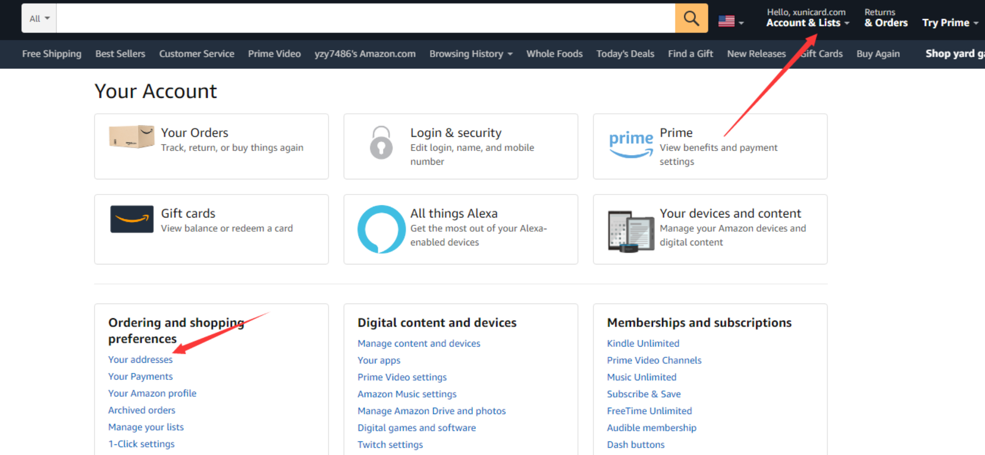 3.点击右上角自己的账号名称.进入账号面板,点击your address(添加收货地址)
