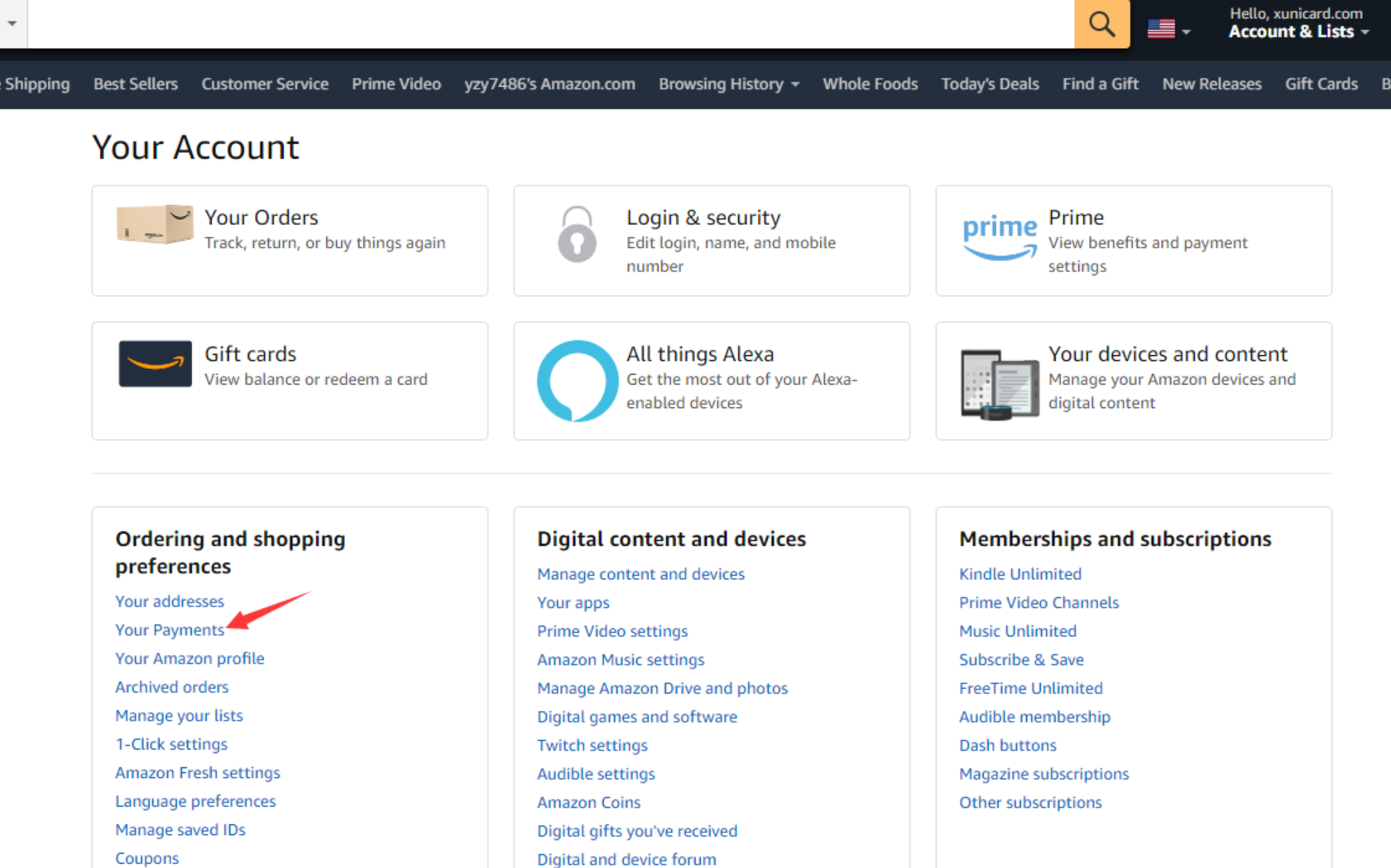 5.回到刚才的账号管理页面,点击your Payments(付款方式)