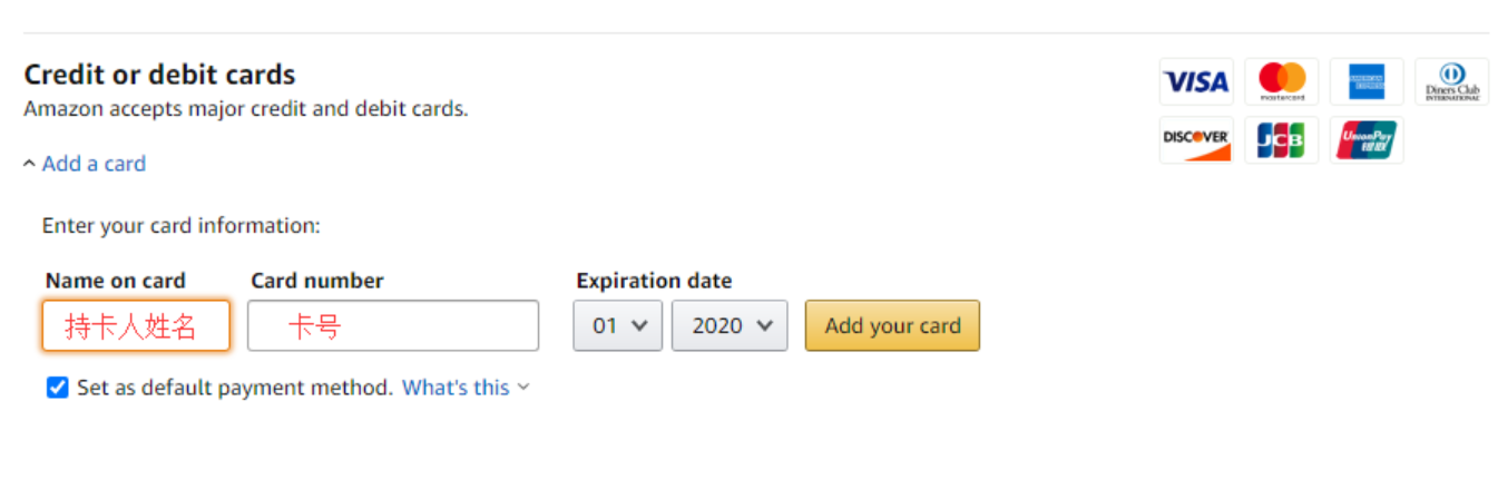 6.页面下方有一个使用信用卡支付的选项,点击Add a card(添加信用卡)