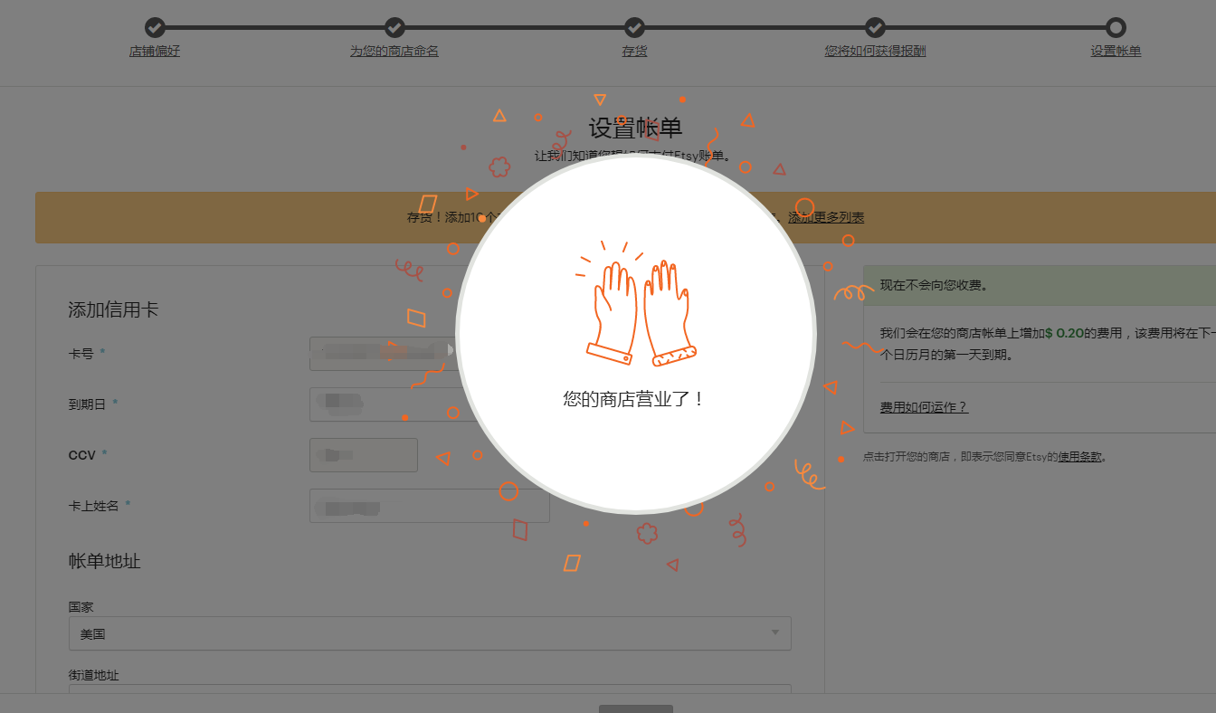 11.最后一步是填自己用来缴店铺月租费的信用卡了。第一次绑定需要扣0.2美元的费用。这里我是使用虚拟信用卡开卡平台的虚拟信用卡来支付的。