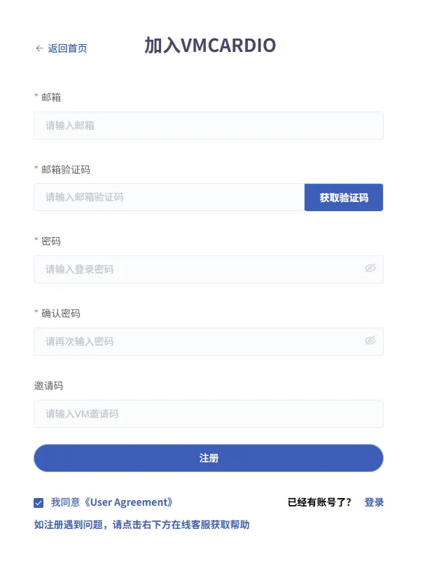 - 访问官网 https://vmcardio.com/ ,使用邮箱注册账户。