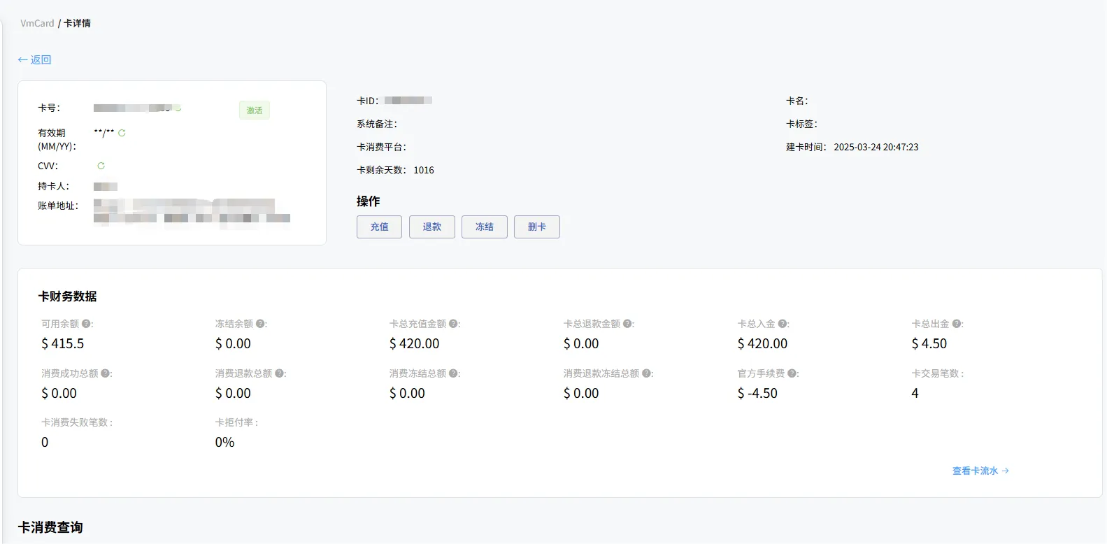 - 在Vmcard后台查看扣款记录(路径:VM储值卡>卡消费详情):